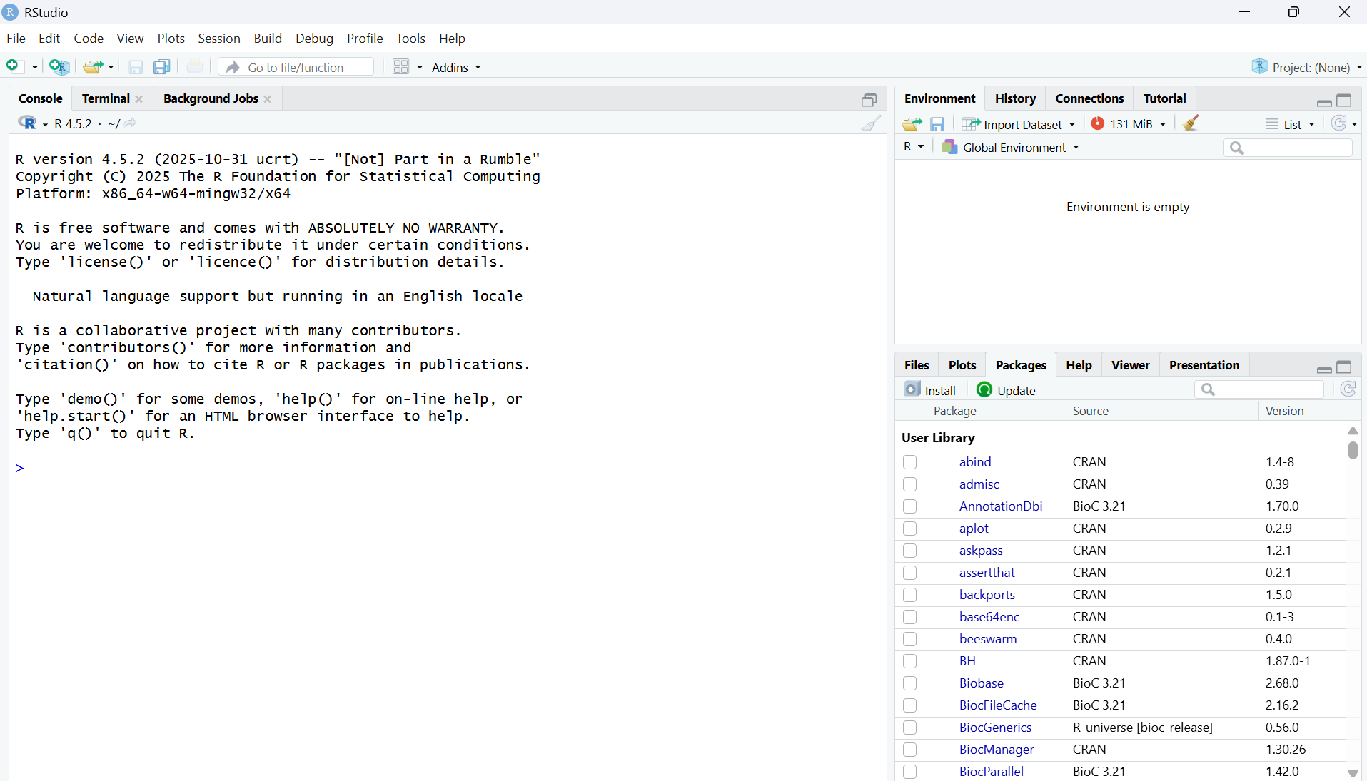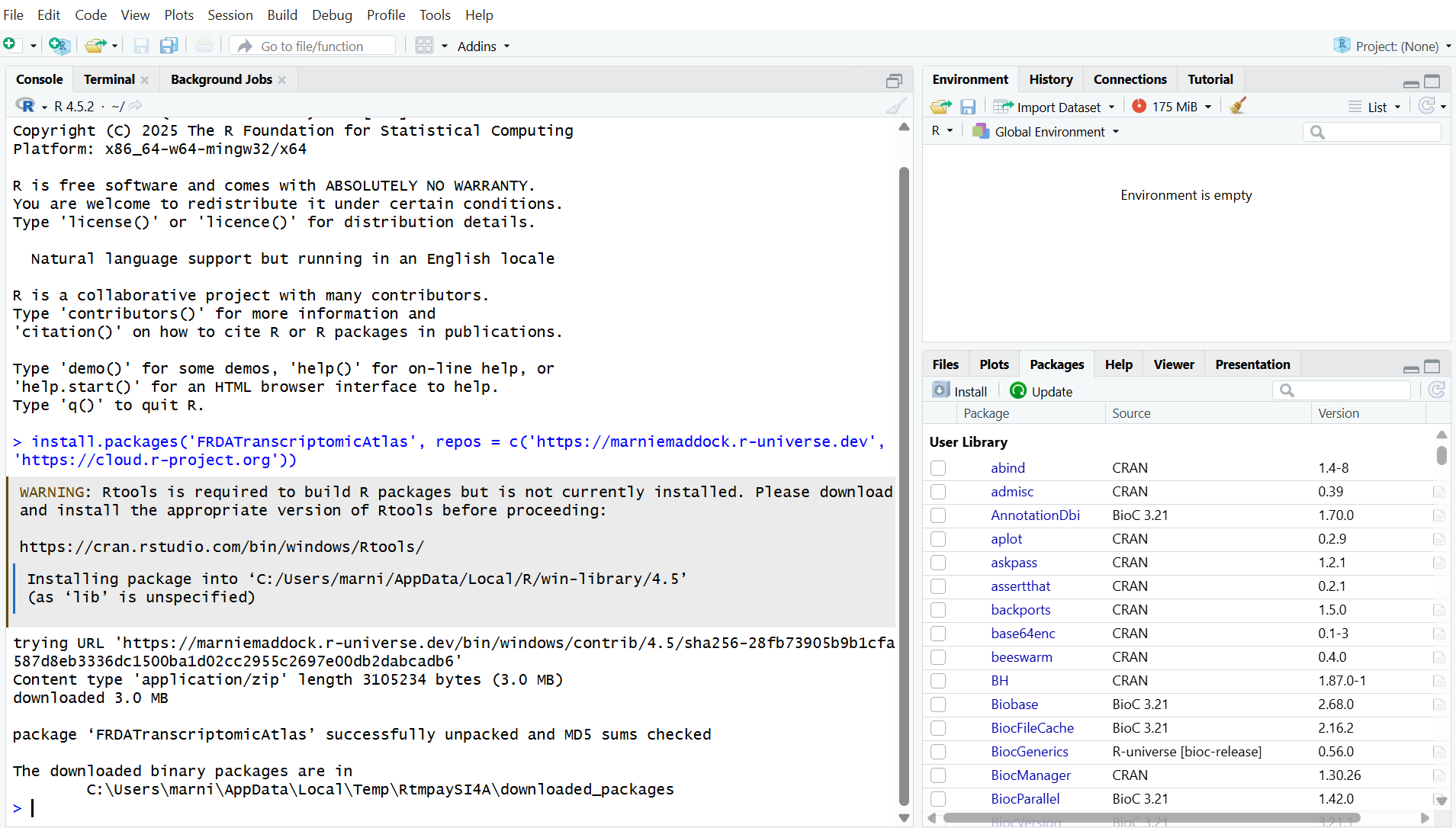 install.packages('FRDATranscriptomicAtlas', repos = c('https://marniemaddock.r-universe.dev', 'https://cloud.r-project.org'))Once the installation has completed, a > will appear in the console. It will say something similar to ’the downloaded binary packages are in …`. You may recieve a warning saying that Rtools is required to build packages. This is not an issue and can be ignored.