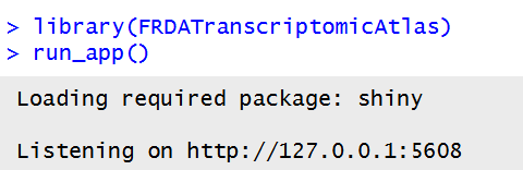 library(FRDATranscriptomicAtlas)This itself will not open the application. To open the application, run: